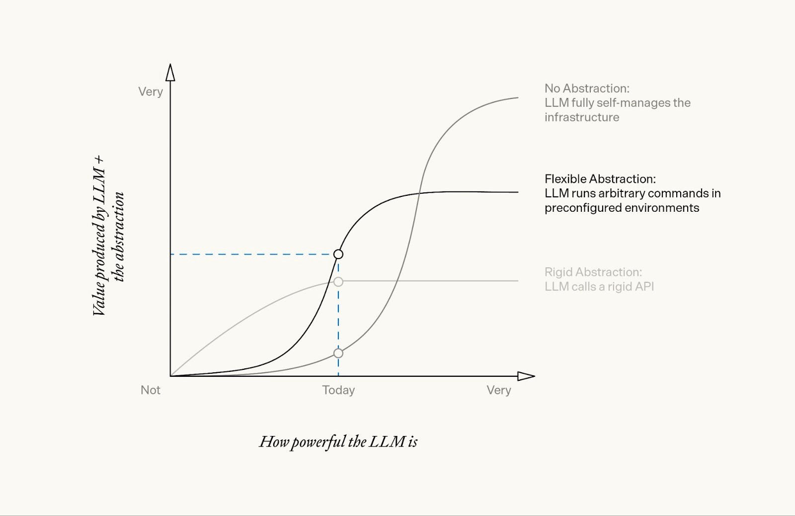 We expect that this flexible abstraction will continue to become more valuable as LLMs become more powerful, up until the point that the agent is able to effectively self-manage more complex infrastructure and its own environments.