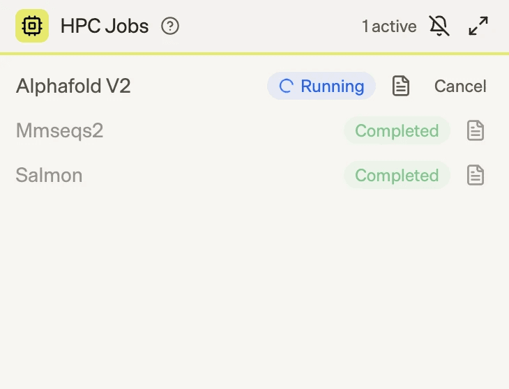 We also built an HPC Jobs widget that provides real-time visibility into running jobs. Researchers can monitor live job status, inspect logs at any time, and cancel jobs if they detect unexpected behavior. If a job is canceled, the callback mechanism immediately notifies the agent, which then continues the workflow accordingly.
